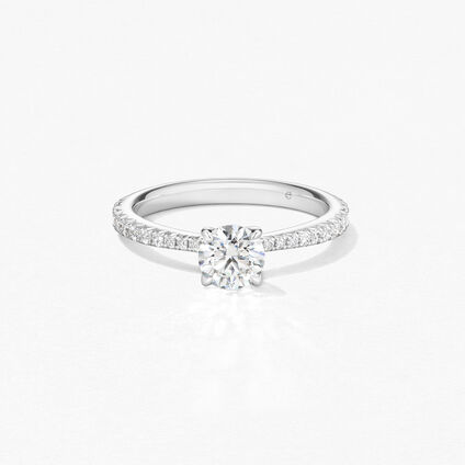 The Vela Solitaire Ring with Diamond Band shines with elegance. Its clean, modern setting allows the center stone to be viewed from all angles while the fully pavéd diamond band creates unparalleled sparkle.